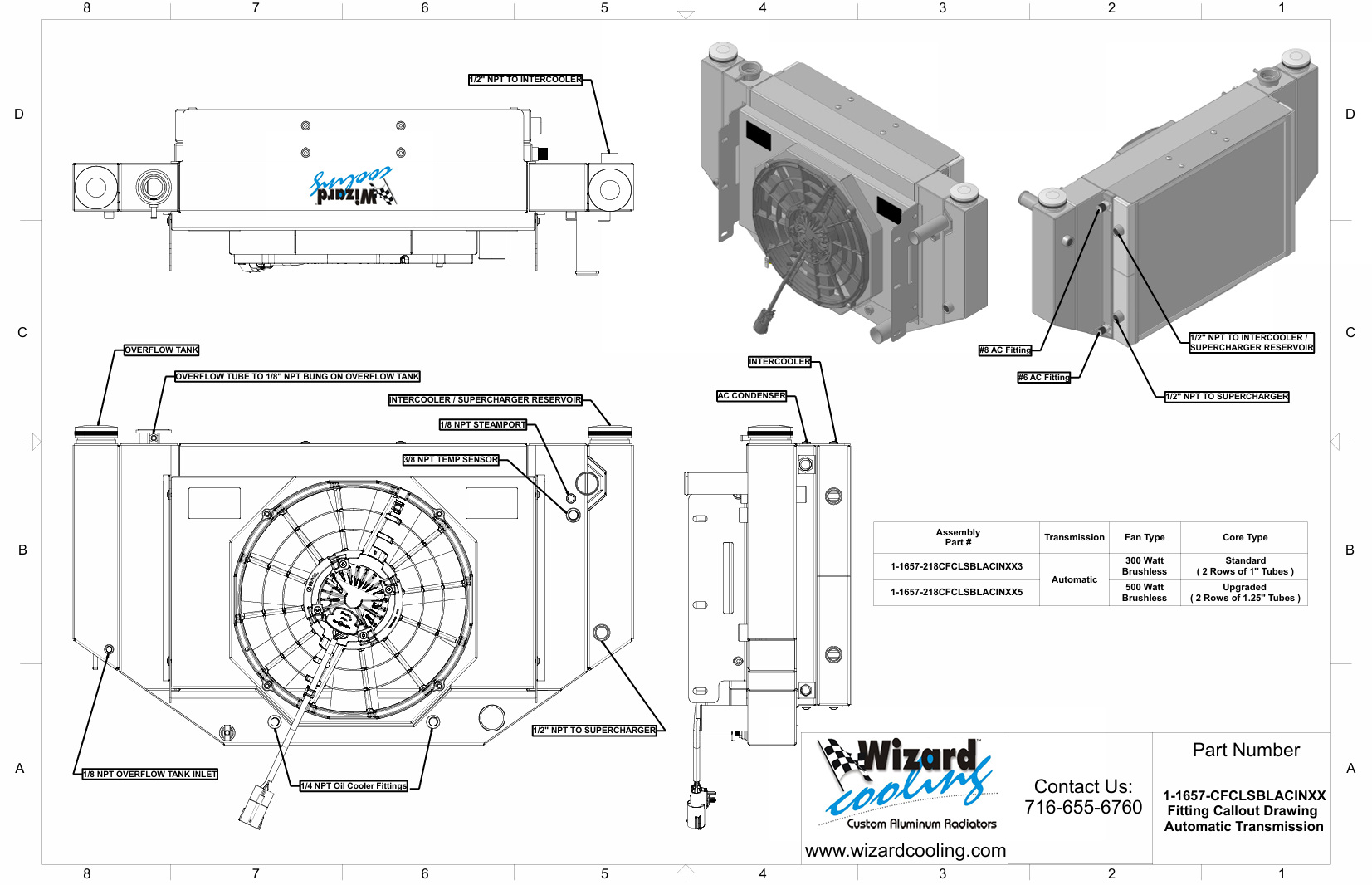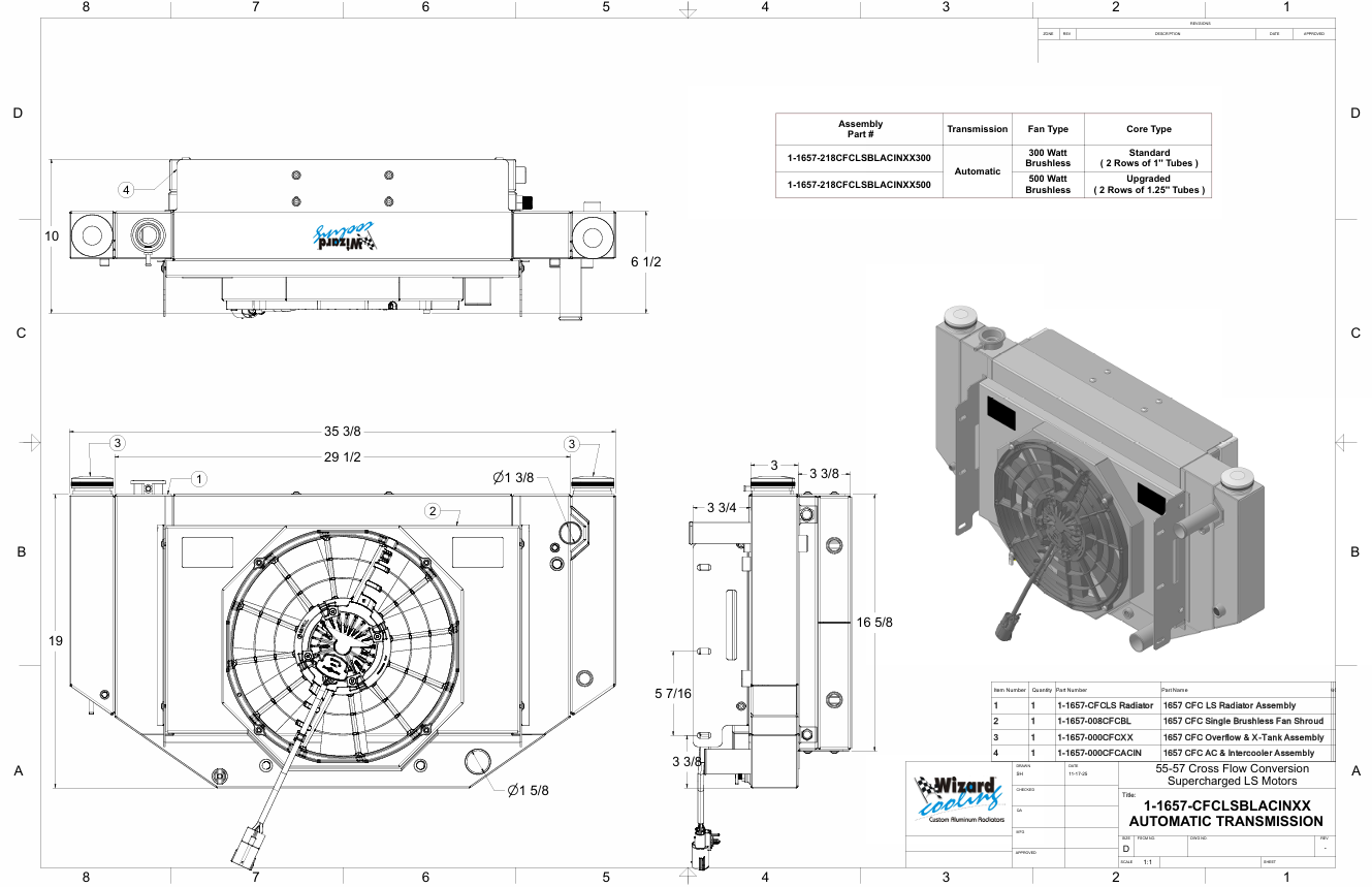 LS Swap, LS (Supercharged), V8 Core Support (Cross Flow Conversion Radiator), Automatic Transmission, 2.25” Core, Shroud & Brushless Fan(s), AC Condenser Tank(s)