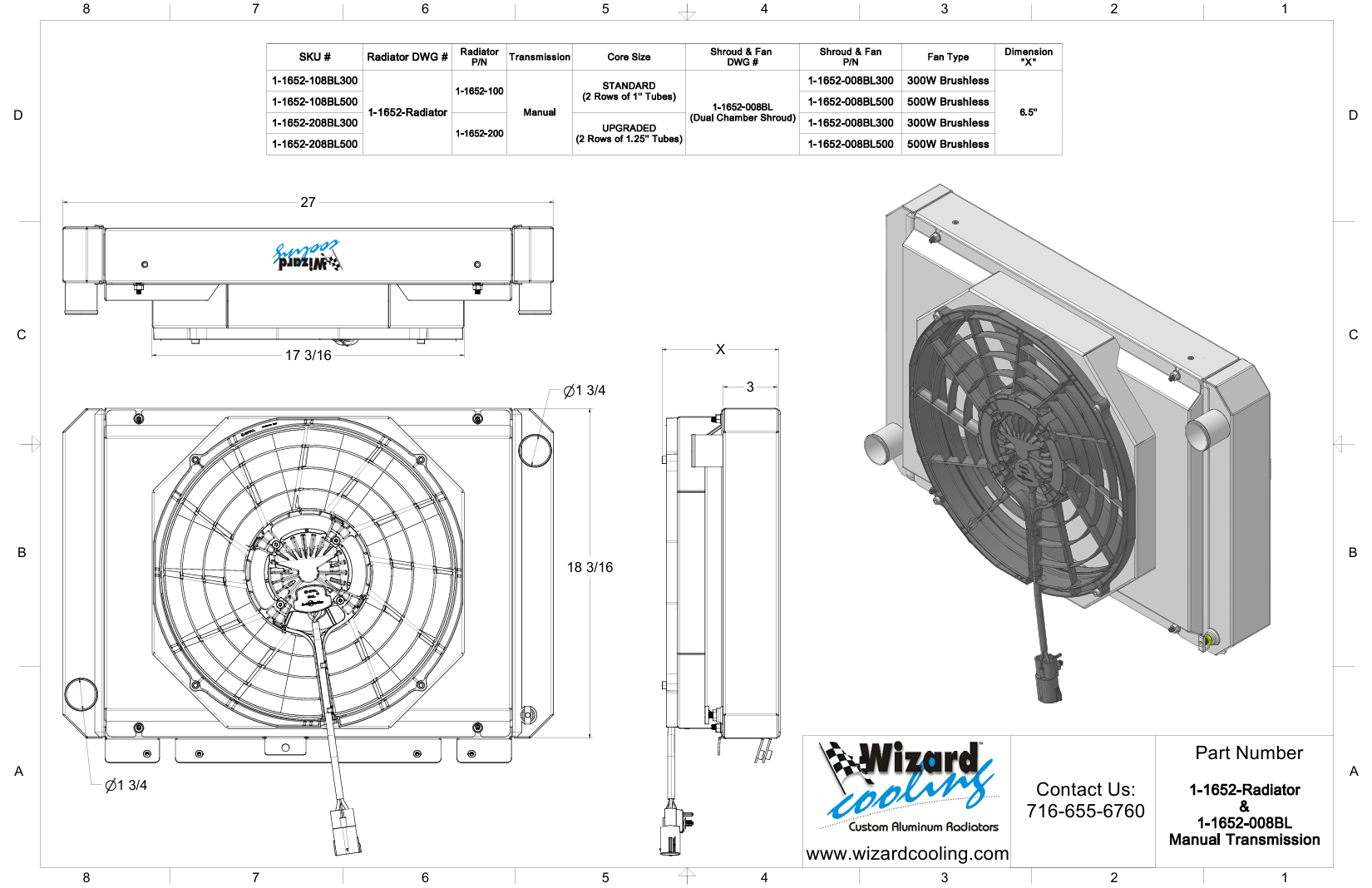 1964-65 Ford Thunderbird Aluminum Radiator (Shroud w/ Brushless Fan) - 1652-208BL300